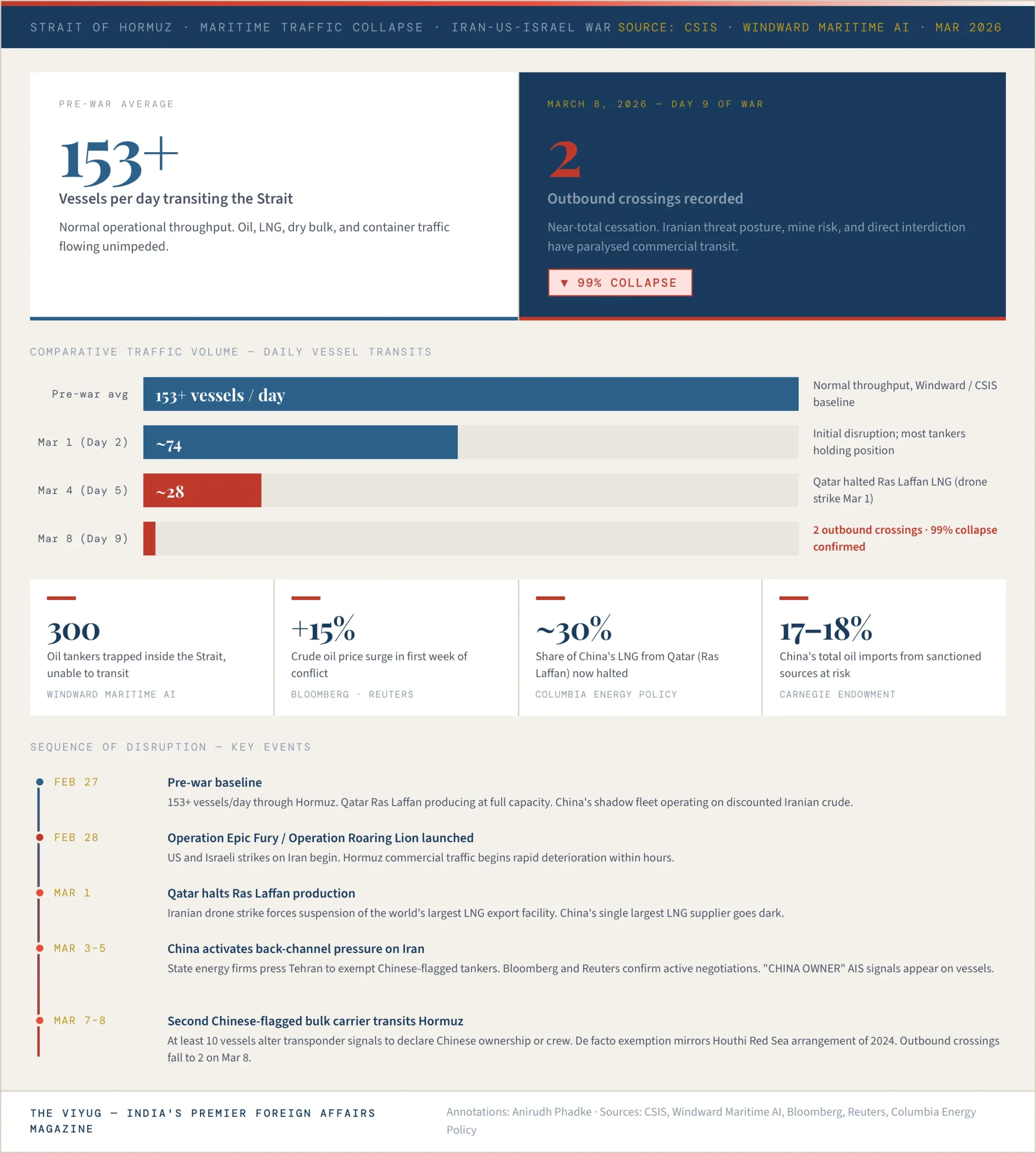The war has now placed that infrastructure under direct stress. Since the conflict began, Strait of Hormuz transits collapsed from a pre-war average of over 153 vessels per day to a mere two outbound crossings recorded on March 8 which is 99 percent disruption according to maritime tracking data from CSIS and Windward Maritime AI. Crude oil prices surged more than 15 percent in the first week of the conflict. Around 300 oil tankers remain trapped inside the Strait, unable to transit safely. On March 1, Qatar halted production at Ras Laffan, the world’s largest LNG export facility, after an Iranian drone strike China’s single largest LNG supplier, accounting for roughly 30 percent of its imports.