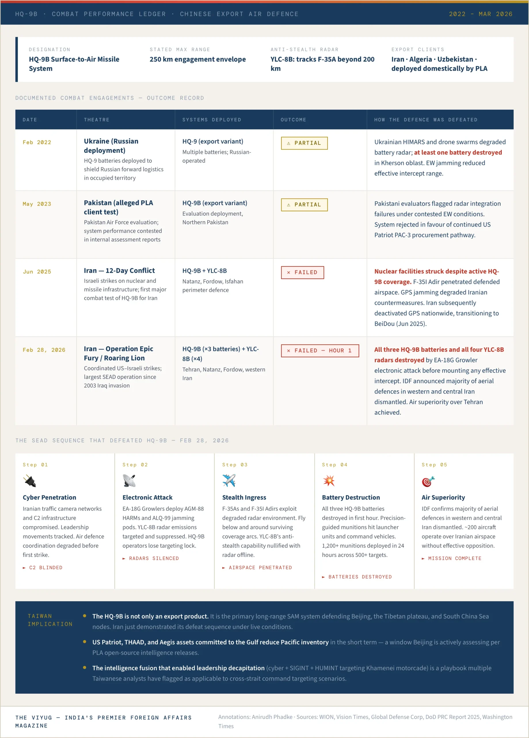 This outcome is not primarily a problem for Iran. It is a problem for China. The HQ-9B is not merely an export product. It is deployed around Beijing, the Tibetan plateau, and the South China Sea to protect the most sensitive nodes in the Chinese mainland’s own air defence architecture. The YLC-8B is a cornerstone of China’s anti-stealth posture. Both systems now carry a verified combat record of failure against a coordinated SEAD — Suppression of Enemy Air Defenses — package using fifth-generation fighters, electronic warfare aircraft, precision-guided munitions, and cyber operations.