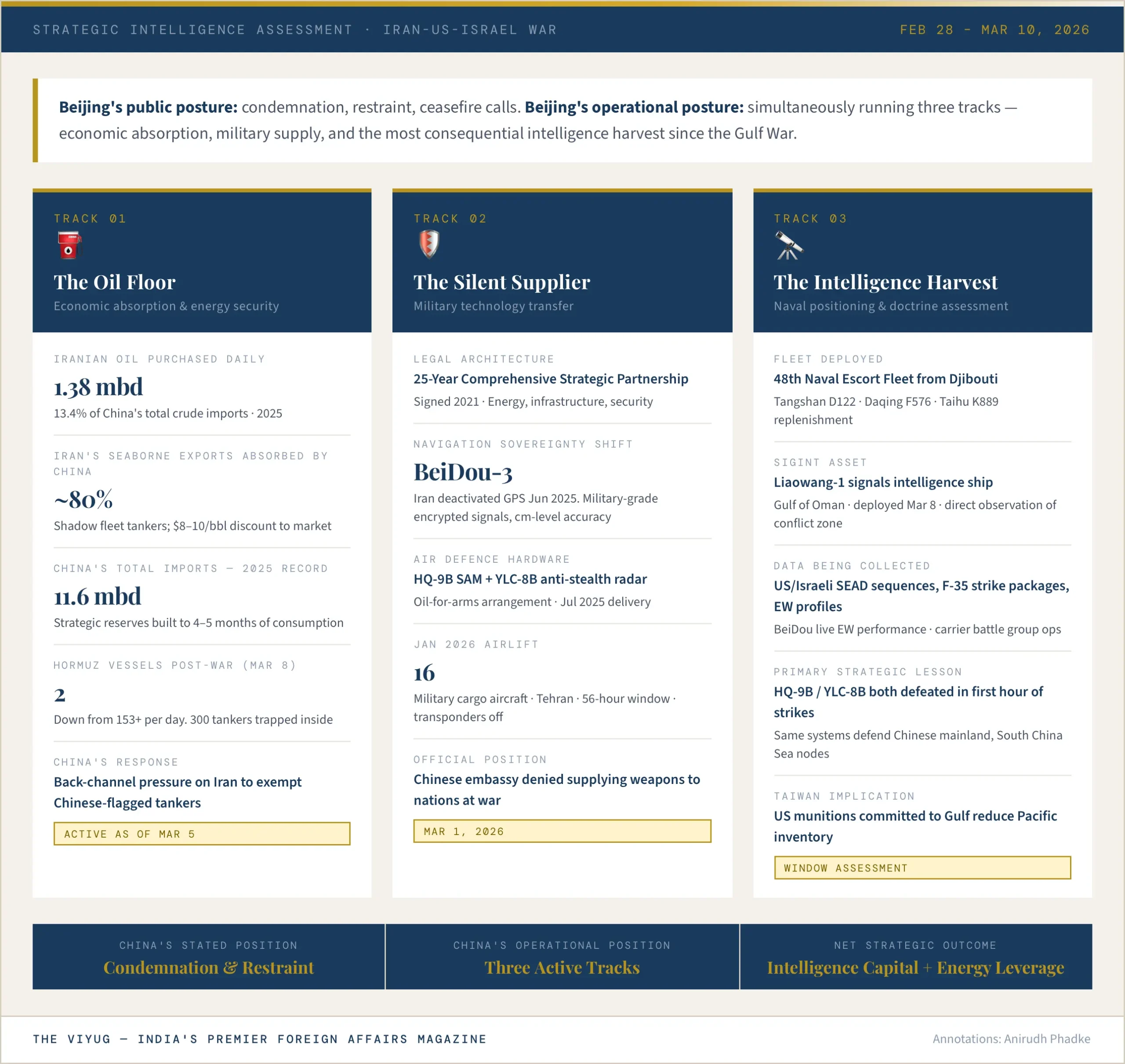 On the surface, Beijing appears to be doing precisely what it always does in a crisis it did not start. That surface reading is incomplete. Below the diplomatic formula, China is running a three-track operation simultaneously one economic, one military, and one that belongs in the vocabulary of strategic intelligence rather than statecraft. Beijing is not a passive spectator wringing its hands over a war it cannot stop. It is the most consequential observer in this conflict, and what it learns, absorbs, and quietly secures in the coming weeks may shape the military balance in the Pacific for a decade.